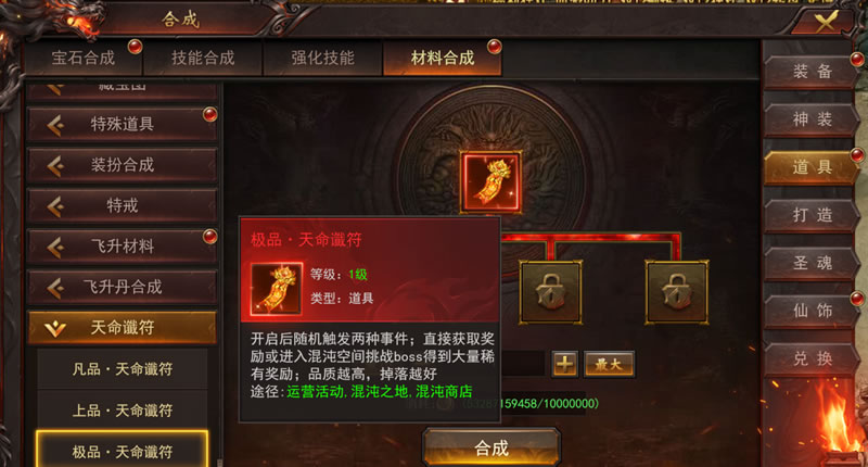 -天命谶符可通过混沌商店兑换碎片进行合成(合成-材料合成-天命谶符)